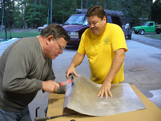 Konrad goes to work on one nasty dent while Jim secures the cowl section